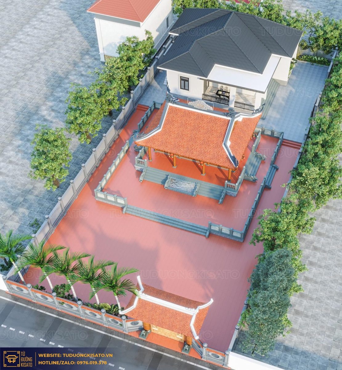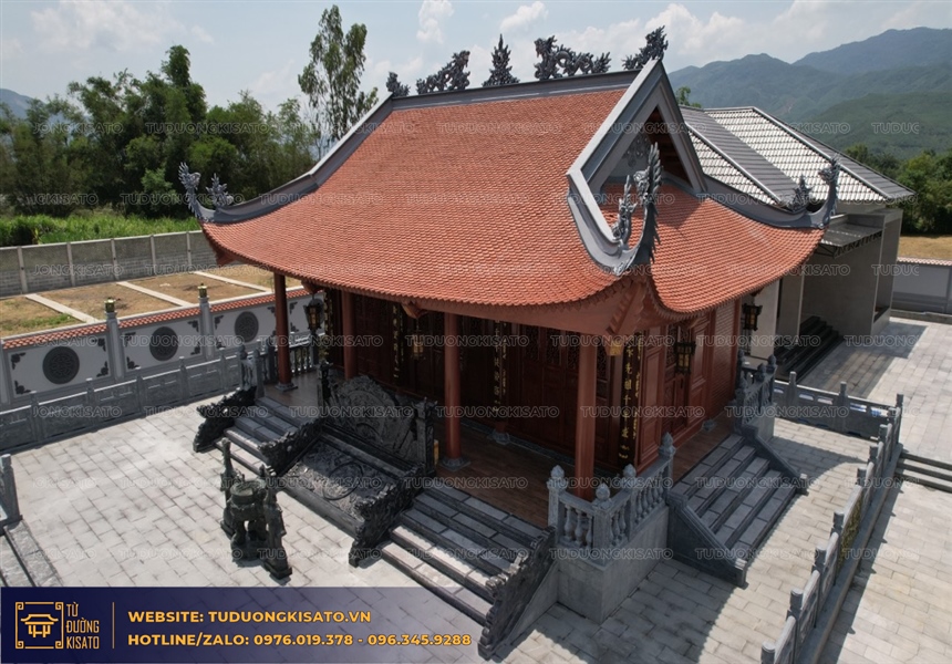 Bậc ngũ cấp giúp công trình mẫu từ đường trở nên cao ráo hơn các công trình xung quanh , mẫu từ đường với hàng rào riêng giúp công trình từ đường được tách biệt với công trình nhà ở, giúp công trình nhà đường trở nên uy nghi bề thế.